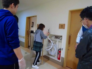 職員は、消火器や散水栓(屋内消火栓)の使い方、避難誘導