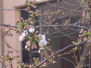 中庭の桜の木が、今日の温かさで一気に開花しました。