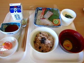 赤飯、お刺身、茶わん蒸し、お吸い物、お祝いまんじゅうなど