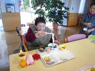 お雑煮をいただきました。 おもち伸びたよと初笑です。