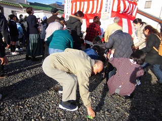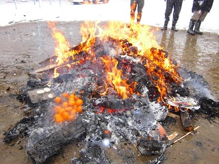 焼きみかんを食べ、炭を額につけ、1年間の健康を願い、お昼に