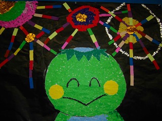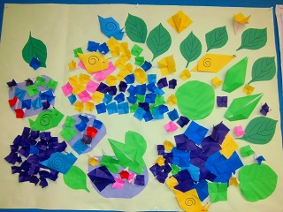 貼り絵と折り紙の作品です。みんなで配色を考えながら、