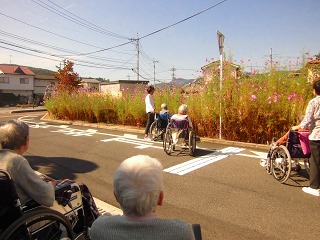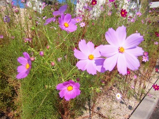 ケアハウス上河原の西側入り口のコスモスが満開となりました。