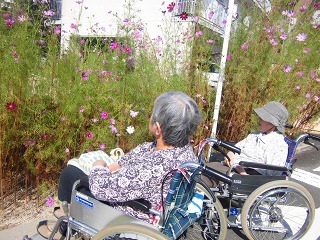 ケアハウス上河原の中庭には、いつもいろいろな花が咲いています。