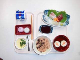 そして、お昼ご飯は「赤飯」「お刺身」「茶碗蒸し」「紅白饅頭」