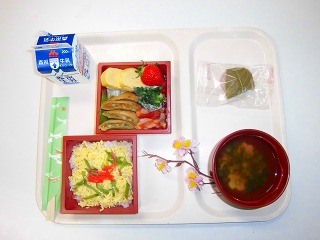 ちらし寿司、蛤の清まし汁、菜の花とタコの酢みそ、ひなあられ