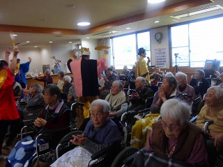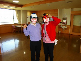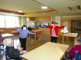 感染対策のため、今年は赤鬼と青鬼が利用者の部屋を訪問し、