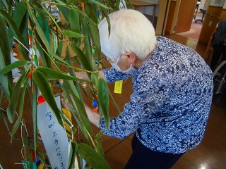 笹の葉に一人ひとりが願いを書きとめた短冊を飾りました。