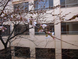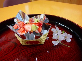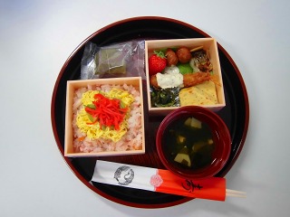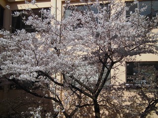 中庭の満開の桜を眺めながら、全員で「お花見弁当」をいただきました。