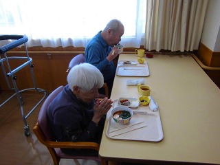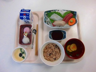 お昼は、赤飯、お刺身、茶わん蒸し、すまし汁、紅白まんじゅうを